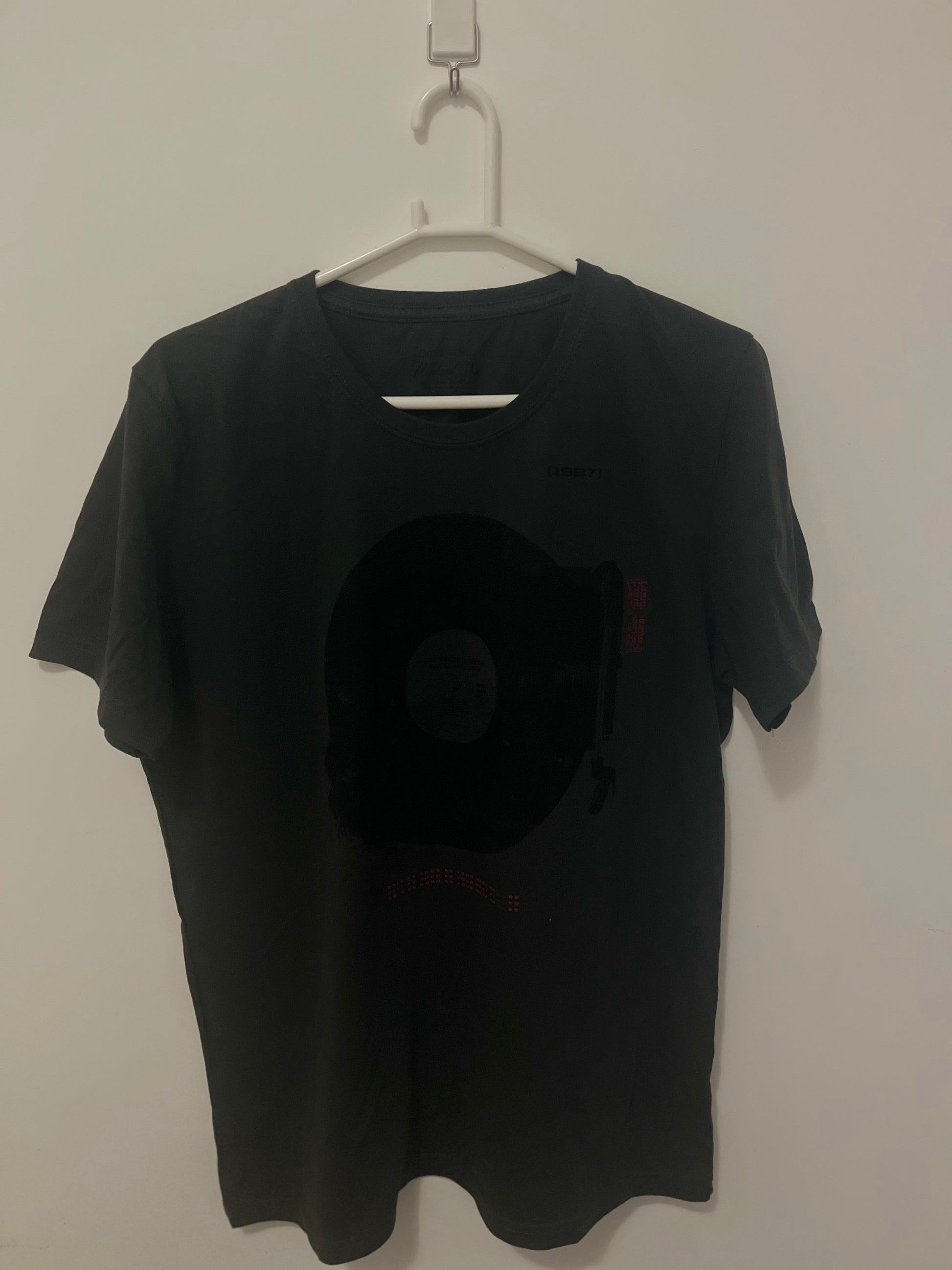 Detalhe: Camiseta com ilustração de vinil DJ da Luigi Bertolli.