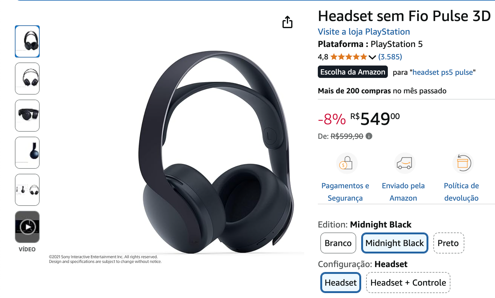 Detalhe: Fone Headset conexão Bluetooth com conector USB feito especialmente para PS5 mas compatível com PC e outros sistemas que utilizam entrada USB/Bluetooth. Comprado na época por R$ 600 reais (Conforme Print).